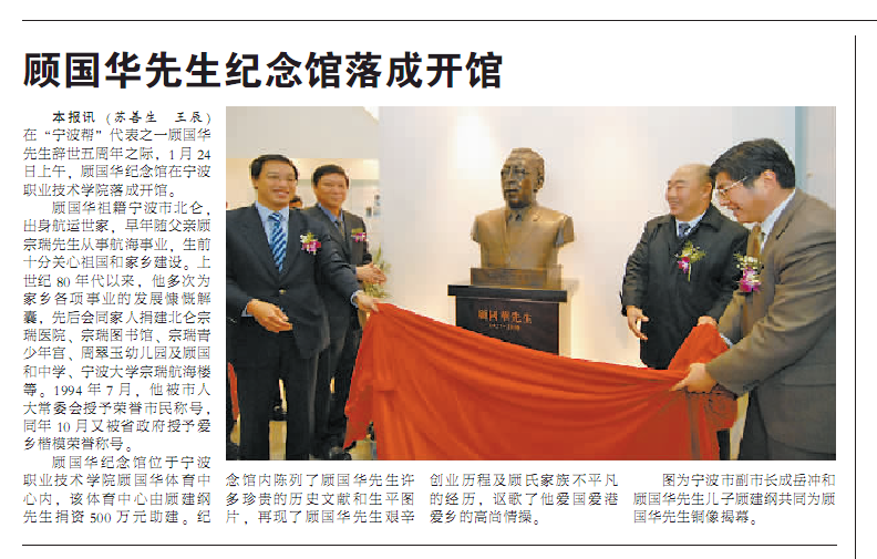 本报讯(苏善生 王辰)在“宁波帮”代表之一顾国华先生辞世五周年之际,1月24日上午,顾国华纪念馆在宁波职业技术学院落成开馆。