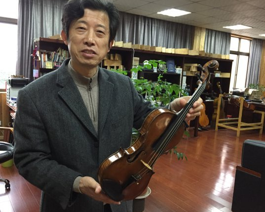 上到二楼,胡晓光提琴工作室里亮着灯。介绍这个独门专业,胡晓光是一个不得不提的人。他原本是一名古典音乐教师,小提琴演奏造诣颇深。人到中年,却忽然转向,跟随上海音乐学院副院长、国内首屈一指的提琴制作工艺师华天礽学提琴制作,获国家二级提琴技师证书,是乐器制造专业负责人。