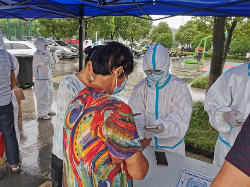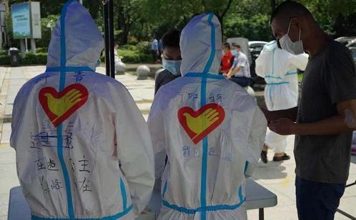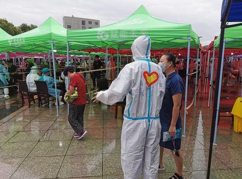 检测这天的最高气温达到30℃,志愿者们穿着密不透风的防护服,从早到晚,虽然极其闷热、全身湿透,但谁都不肯被替换下来休息。完成每一轮采样的间隙,他们仍没有空闲下来,帮助维护现场秩序,协助检测者扫描登记个人信息,耐心解答大家提出的各种问题。