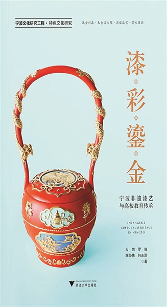 近日,《漆彩鎏金:宁波非遗漆艺与高校教育传承》由浙江大学出版社出版,此书由宁波职业技术学院丝路艺术研究中心科研团队万剑、罗俊、姚炬炜、何东润撰写。它系统地梳理了泥金彩漆、朱金漆木雕、彰髹漆艺、骨木镶嵌等宁波非遗漆艺的历史源流,又描述了当下现状,更结合高校教育创新实践,探索了基于活态传承的漆艺发展路径。
