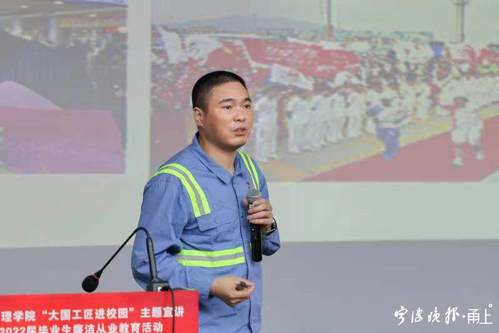 6月9日,在宁波职业技术学院2022届毕业生离校前夕,该校工商管理学院邀请全国劳动模范、“大国工匠”竺士杰,为即将走上工作岗位的大学生上了一堂生动的“毕业党课”。