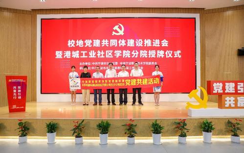 会议发布了2022年度校地党建共同体建设重点项目和港城工业社区学院年度重点培训项目,江智灵和杨晓波代表校地双方为新成立的港城工业社区学院8个分院授牌。