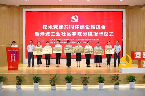 6月27日,北仑区区委和宁波职业技术学院党委在春晓湖工业社区联合举行校地党建共同体建设推进会暨港城工业社区学院分院授牌仪式。北仑区委组织部部长周成钢,北仑区委组织部副部长、区委两新工委书记江智灵,宁波职业技术学院党委副书记马苗金,宁波职业技术学院党委委员、组织部部长杨晓波等领导出席活动,各街道、社区负责人、企业代表、宁职院师生代表参加活动。