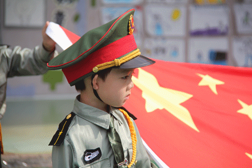 建德市乾潭中心幼儿园的孩子们穿上鲜艳的迷彩服,如同保家卫国的小战士。他们手挥红旗,可爱的笑容满怀对祖国的祝福。