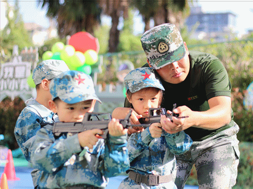 嵊州市开发区幼儿园的孩子们身着迷彩服,以情境性体验的方式,将红军爬雪山过草地的革命元素融入到自主游戏中,通过搭城楼、唱红歌等一系列多元化活动感知生于华夏,何其有幸。