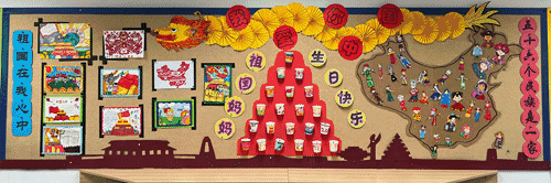杭州市余杭区良渚七贤小学的少先队员们以“我和我的祖国”为主题设计板报。