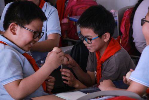 过立夏怎可少了拄蛋。当魏老师讲解完斗蛋的规则和小窍门之后,同学们就捉对厮杀起来了。“加油,加油!”“耶,我赢了!”教室里一片欢腾。每个小学生都感受到了立夏的快乐。