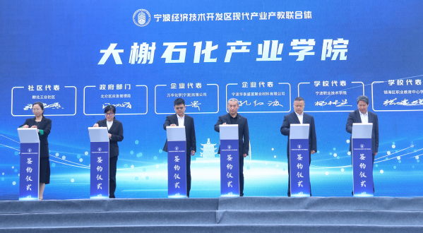 榭北工业社区、北仑区应急管理局、万华化学(宁波)、宁波华泰盛富聚合材料、宁波职业技术学院、镇海职教中心等代表,共同签约成立大榭石化产业学院。