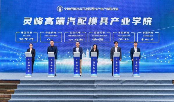 灵峰工业社区、宁波北仑压铸模具协会、拓普集团、臻至机械模具、浙江工商职业技术学院、北仑职高等代表,共同签约成立灵峰高端汽配模具产业学院。