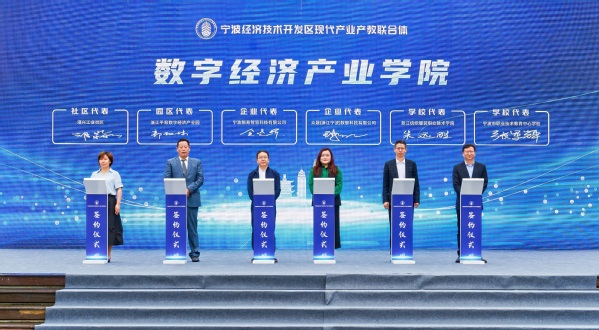 港兴工业社区、浙江平易数字经济产业园、新易智慧科技、众晟(浙江宁波)数智科技、浙江纺织服装职业技术学院、宁波职教中心等代表,共同签约成立数字经济产业学院。