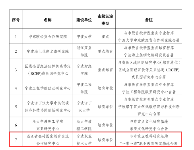 近日,宁波市哲学社会科学工作办公室发布《关于建立宁波市市级区域国别研究中心的通知》(甬哲社科办〔2025〕18号),正式公布市级区域国别研究中心名单。我校“浙江省金砖国家教育交流合作研究中心”成功入选,被认定为市级培育单位。这一突破标志着学校在服务国家对外开放战略、深化职业教育国际交流合作方面迈出关键一步。