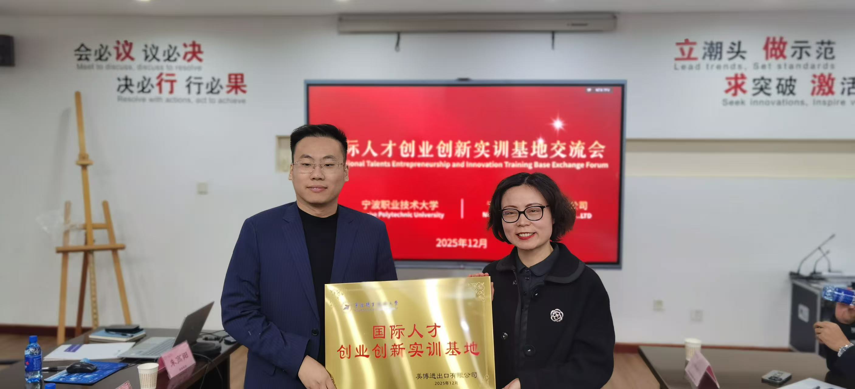 在美博的直播展厅,留学生通过企业VR展厅直观了解“保税仓+直播”全链条运营模式,感受中国跨境电商的蓬勃活力。随后举行的“国际人才直播实践基地交流会”上,国际商旅学院副院长吴安萍与美博代表正式签署合作协议,共同为“国际人才创新创业实训基地”揭牌。该基地旨在整合高校教育资源与产业平台优势,打造集“学习—实训—就业—创业”一体化实习实训平台,为留学生提供真实商业场景下的跨境电商直播实训,助力其走近宁波,切身感知区域“跨境电商+产业带”模式的蓬勃发展生态。美博负责人在交流中表示,企业急需多语种国际商贸人才,期待通过实训基地实现“培养即就业”,为跨境电商业务注入国际化动能。