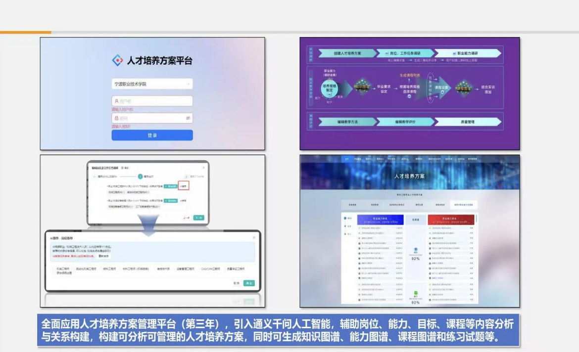 教学要素解构,育人思路再造。具备AI功能的人才培养方案系统将人才培养过程按教学要素进行分解,应用AI智能分析岗位、工作任务、能力要求。一是多模数据融合定位培养目标。应用AI智能分析社会发展需求、人才培养标准与学生发展需要,辅助人才培养目标生成。二是智能分解知识点与技能点。根据职业、岗位、典型任务等内容,应用AI智能分解岗位能力要求,辅助生成专业各课程的教学知识点、技能点和素质点,并根据大模型进行智慧补充。三是AI+图谱动态解构教学内容。剖析课程知识的内在联系,自动生成能力图谱、知识图谱、课程图谱,并根据相关内容向教师智能推荐教学方法与教学内容,辅助进行课程设计。