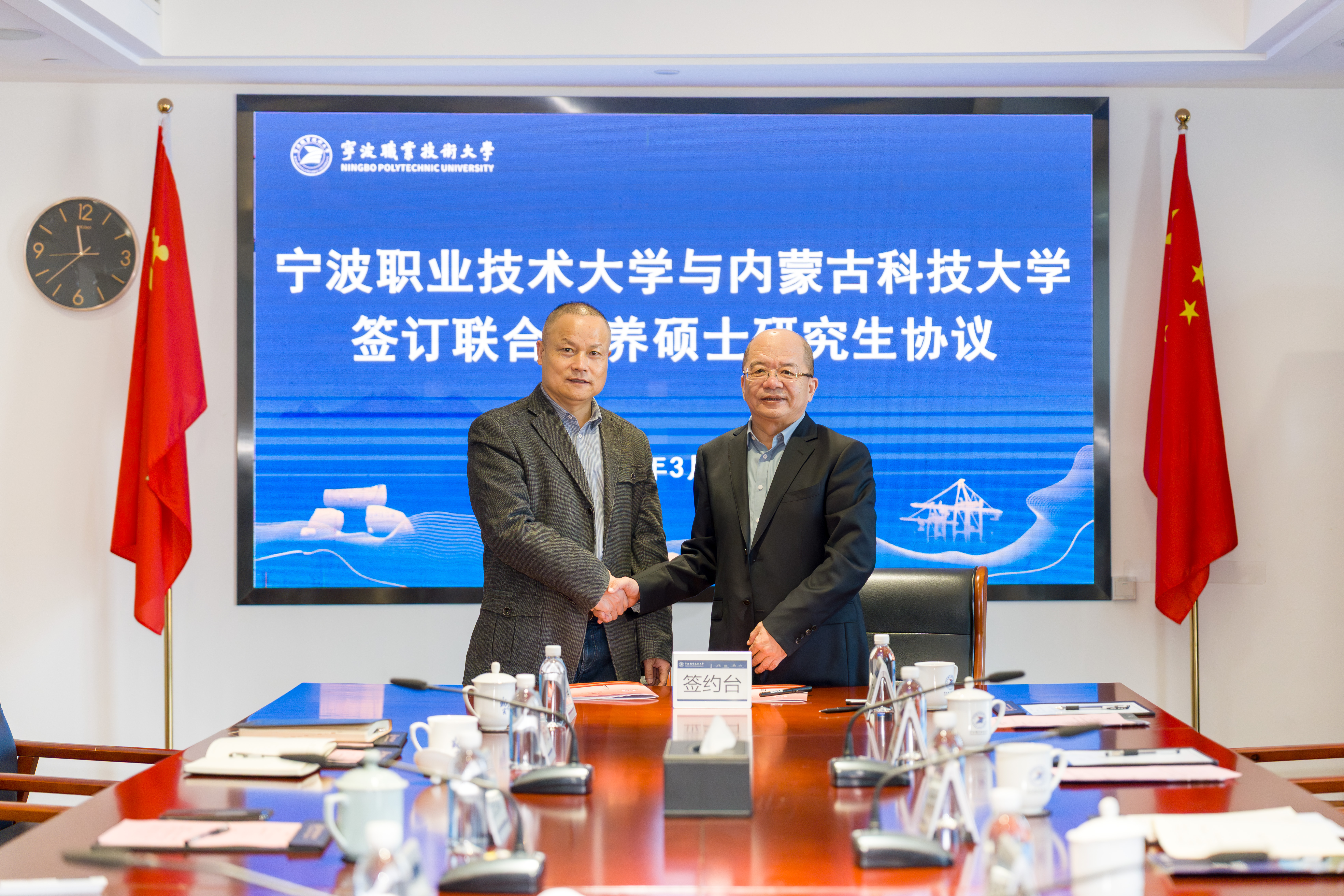 交流会上,双方围绕专业硕士联合培养、导师队伍科教融汇、产教融合、学科建设等展开深入研讨。呼和书记表示,内蒙古科技大学在工科领域积累了深厚的学科底蕴与人才培养经验,期待通过此次合作,整合两校优势资源,构建协同育人的新范式。张慧波书记代表学校对内蒙古科技大学一行的到来表示热烈欢迎,希望能够通过此次交流,为两校搭建起优质合作平台,开启校际协同发展新篇章。吴向鹏校长从学校整体概况、办学理念、未来发展规划等方面作详细介绍,分享了我校在产教融合、科教融汇方面的探索实践与经验做法强调联合培养是学校推进专业硕士学位授予单位创建的重要举措,将为区域产业发展输送更高层次的专业人才。与会期间,在双方领导的共同见证下,宁波职业技术大学副校长杨林生与内蒙古科技大学副校长屈忠义代表两校正式签订联合培养硕士研究生协议,标志着我校硕士研究生导师队伍建设办学层次将进一步提升,联合培养专业学位硕士研究生工作取得实质性的新进展,这对我校硕士学位授权点申报和学科专业发展、人才培养质量及办学层次的提升具有里程碑意义。