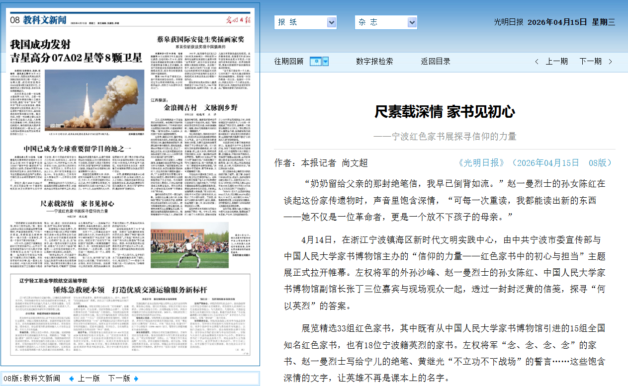 4月14日,在浙江宁波镇海区新时代文明实践中心,由中共宁波市委宣传部与中国人民大学家书博物馆主办的“信仰的力量——红色家书中的初心与担当”主题展正式拉开帷幕。左权将军的外孙沙峰、赵一曼烈士的孙女陈红、中国人民大学家书博物馆副馆长张丁三位嘉宾与现场观众一起,透过一封封泛黄的信笺,探寻“何以英烈”的答案。