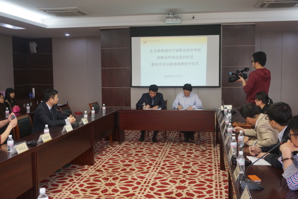 4月26日,由我校产学合作办公室牵头,宁波职业技术学院与宁波经济技术开发区泰悦置业有限公司北仑银泰城管理分公司(以下简称“北仑银泰城”)签署了战略合作协议,并为北仑银泰城成为我校学生校外实训基地授牌。宁波北仑银泰城管理分公司总经理袁炜、学校副院长郑卫东参加了签约仪式。