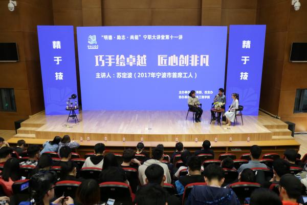 4月25日,苏定波作为优秀校友做客《宁职大讲堂》,跟在场的学弟学妹们分享了他学习工作中的成长经历。2017年10月,他以高出第二名20分的优异成绩,获得了宁波市职工技能大赛绘图项目第一名,因而获得了2017年度“宁波市首席工人”称号。