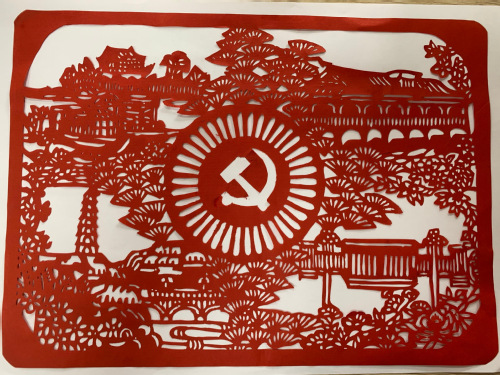 紧接着,学生们拿出红纸开始裁剪雕刻。在老师的讲解和示范下,大家用雕刻刀、剪刀,一刀一剪,从内到外,红纸翻飞。不一会儿,栩栩如生的党徽图跃然眼前,一幅幅剪纸作品在她们的指尖焕发出了别样的风采。薄薄一张纸、小小一把刀,刻出的是学生们对党的祝福、忠诚与热爱之情,方寸之间,情意满满。
