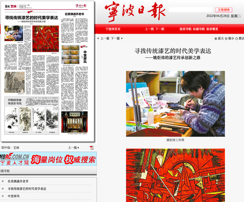 作为湖州人,姚炬炜从江西科技师范大学硕士研究生毕业后,来到位于北仑区的宁波职业技术学院任职,担任非遗漆艺的专任教师,还承担了丝路艺术研究中心的传统漆艺研究和创作工作。而当地文化部门,也把“传承漆艺文化,打响漆画品牌”作为北仑区特色文化发展的方向。姚炬炜在这里找到了施展才华的平台和空间。