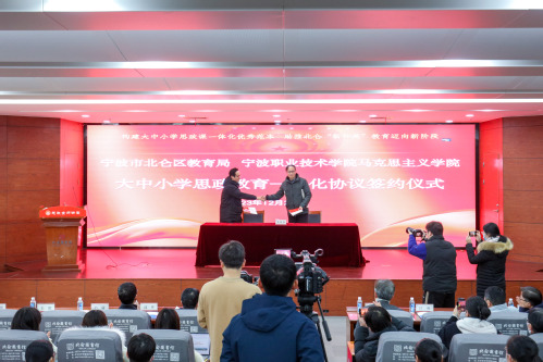 为积极贯彻中央办公厅、国务院办公厅《关于深化新时代学校思想政治理论课改革创新的若干意见》精神,落实《浙江省教育厅关于推进大中小学思政课一体化建设的实施意见》,充分利用各个学段思政教育资源,形成协同育人格局,扎实推进思想政治教育工作开展,北仑区大中小学思政教育一体化协议签约仪式于12月25日在我校图书馆学术报告厅举行。
