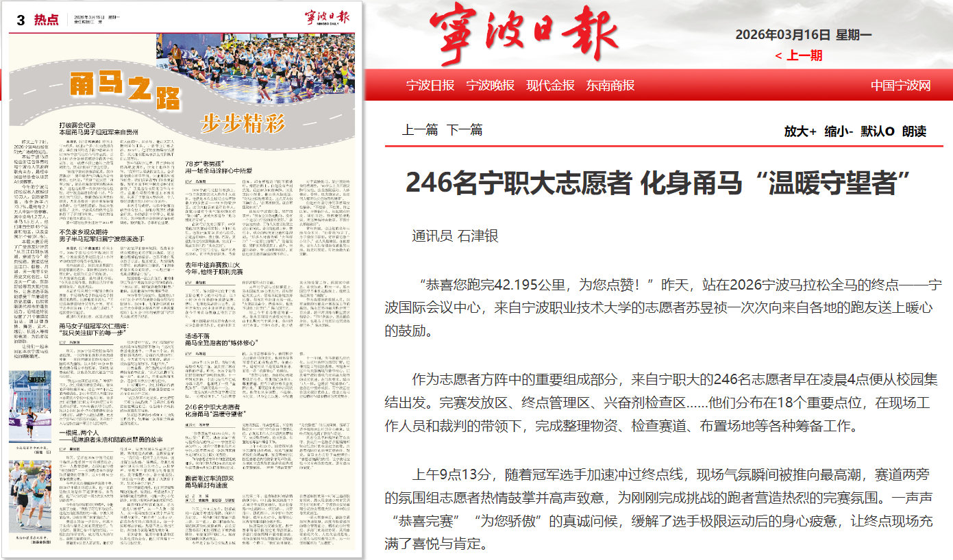 “恭喜您跑完42.195公里,为您点赞!”昨天,站在2026宁波马拉松全马的终点——宁波国际会议中心,来自宁波职业技术大学的志愿者苏昱祯一次次向来自各地的跑友送上暖心的鼓励。