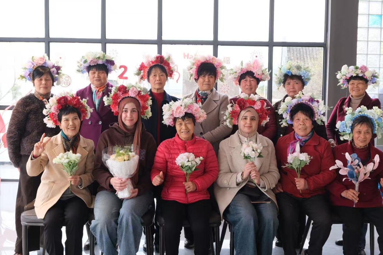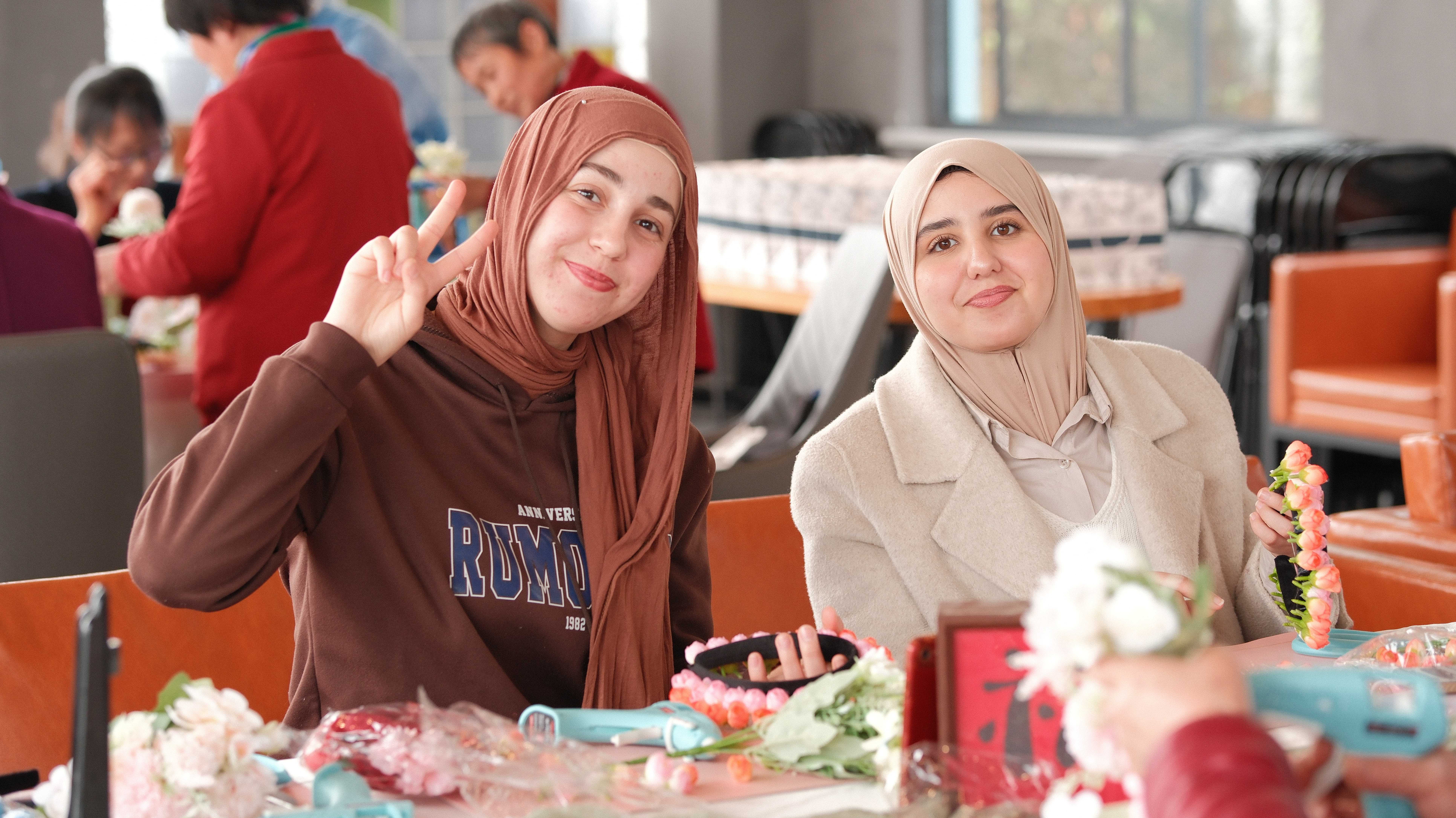 现场氛围格外温馨,处处可见村民参与的鲜活身影:中老年村民大多初次尝试簪花,捧着花材细细斟酌、慢慢调整,眼神专注又认真;年轻村民上手快,主动帮身边长辈递工具、调造型。作为大学老师的文化特派员戴莉莉还特意组织在校留学生共同参与,两位摩洛哥留学生乐花、马佳兴致勃勃地尝试簪花制作,中外友人共聚一堂,笑语不断。