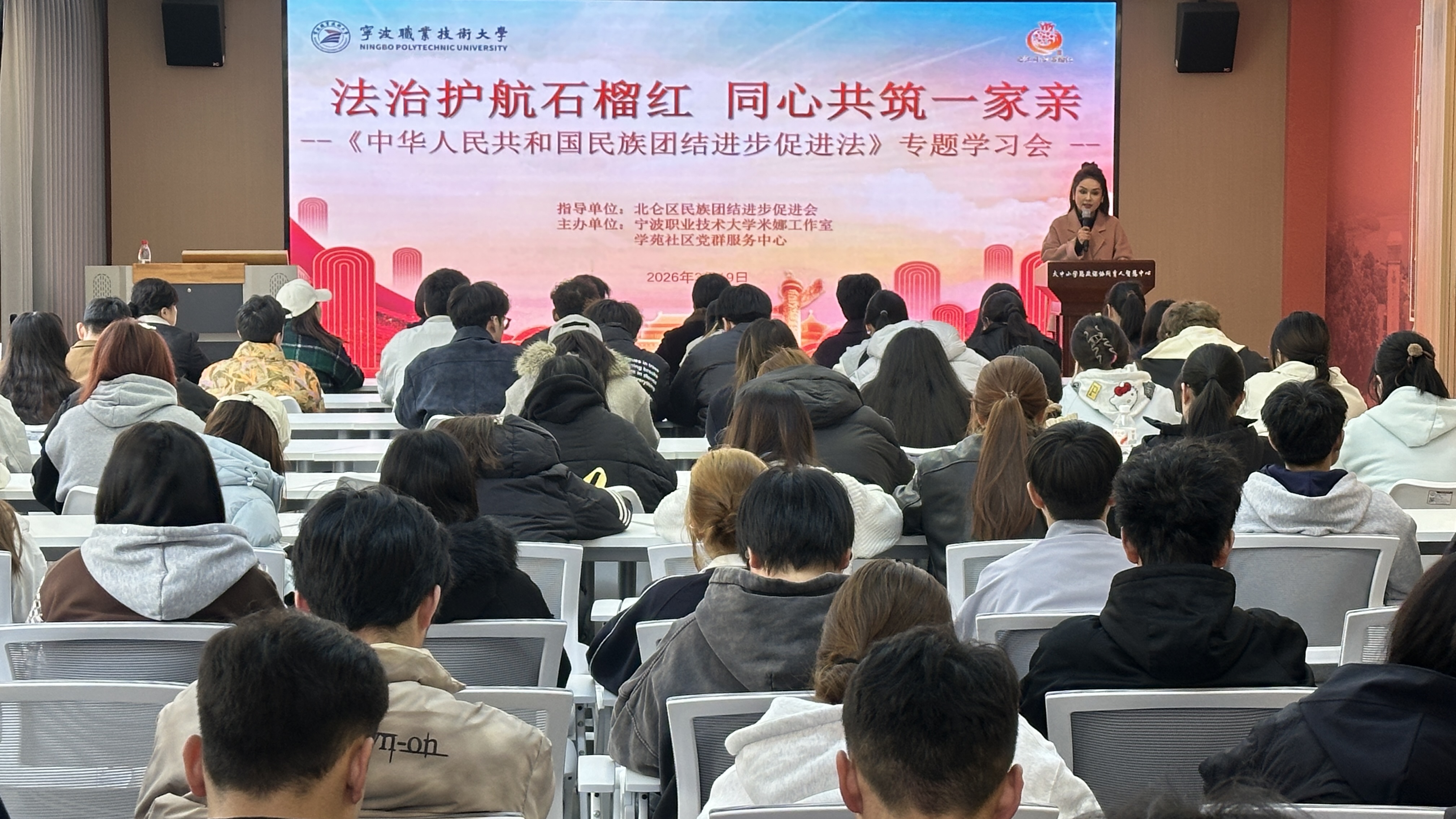 为深入学习宣传贯彻《中华人民共和国民族团结进步促进法》,扎实推进铸牢中华民族共同体意识教育,近日,米娜工作室举办“法治护航石榴红 ·同心共筑一家亲”专题学习会。我校各民族大学生、学苑社区各民族居民代表共100余人参加了活动。