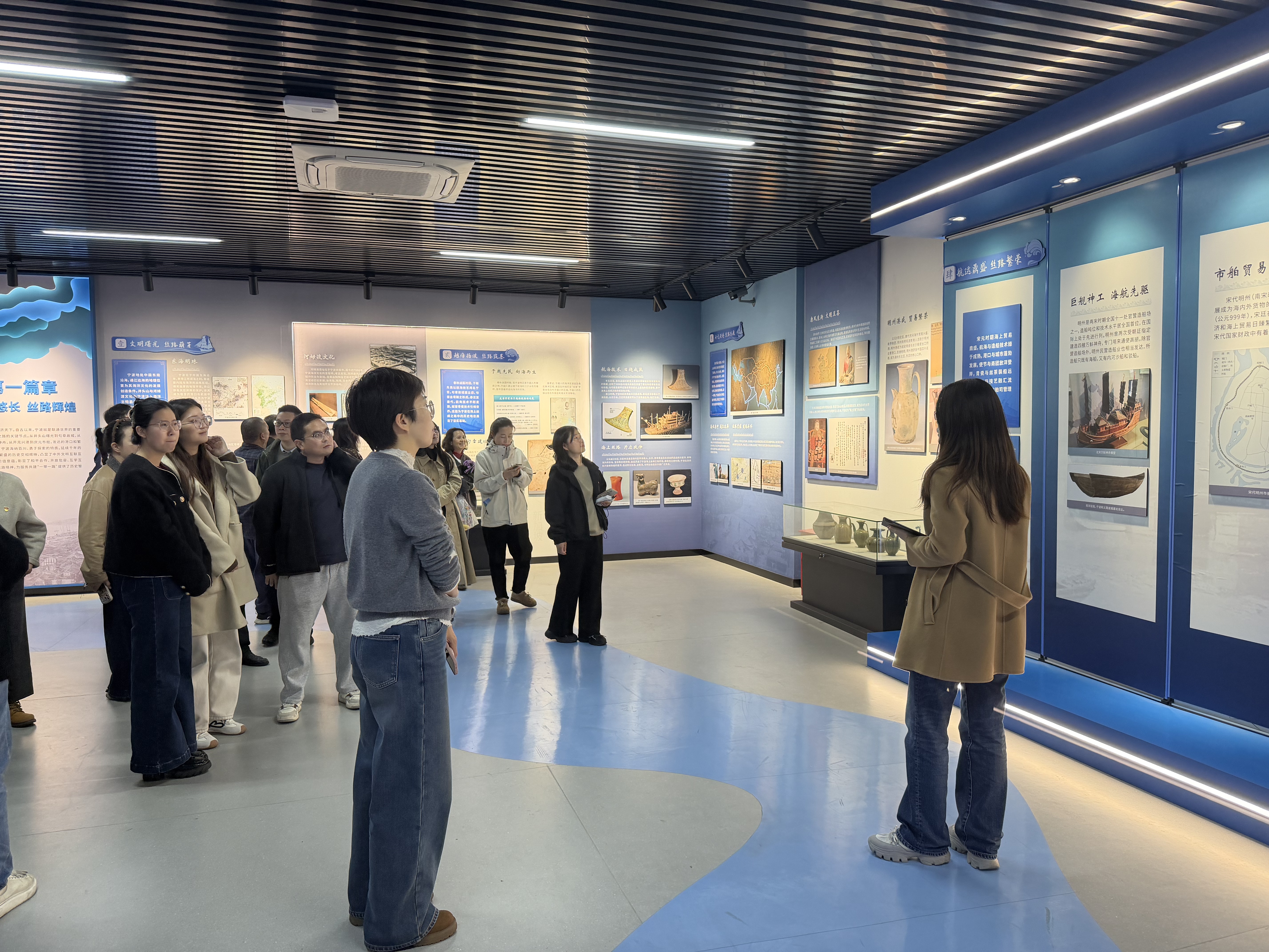 在马克思主义学院副书记刘光艳的讲解下,党员教师深入了解了从古代海上丝绸之路到新时代“一带一路”倡议的壮阔历程。展馆中呈现的学校“职教出海”足迹——从援外培训教学现场、国际学生文化交流瞬间到海外办学基地建设记录,一张张照片、一份份证书生动展现了我校师生在服务国际化工作中的印迹,尤其是几位亲身参与的党员教师们,更是对这些记录倍感亲切。
